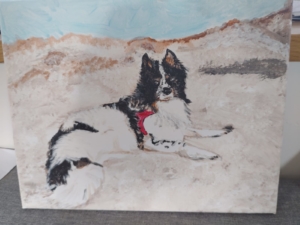 - Mein Seelenhund Ronja ist Anfang der Sommerferien gestorben. Ende Juli habe ich bei der lieben Beata einen Malkurs besucht und ein Bild gemalt und so meine Trauer begegnet. Es fehlt jetzt nur einige Pinselstriche. Nächste Woche beende ich das Bild endlich und werde es aufhängen mit einigen Fotos meiner Ronja.