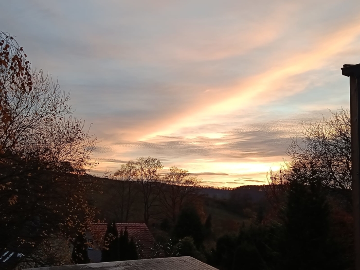 Wenn ich aus meinem Tiny House über das sanft geschwungene Leinbergland nach Südwesten blicke, taucht der Abend die Landschaft in ein warmes, stilles Glühen. Die Sonne sinkt langsam hinter die Hügel und legt einen Schleier aus Orange und Rosé über die Felder – ein Licht, das nur für wenige Minuten existiert, bevor es in ein ruhiges, weiches Grau übergeht.