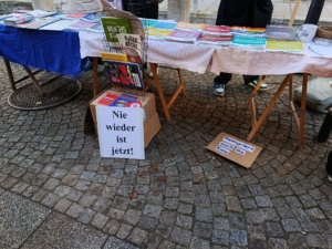 Seitdem stehen wir regelmäßig mit Infoständen in den Orten, organisieren Workshops und Vorträge, gehen auf Demonstrationen. Auch wenn sich die Treffen manchmal wie ein Treffen der jüdischen Volksfront (oder der Volksfront von Judäa) anfühlen: Die Arbeit ist wichtig. Und sie tut gut.
